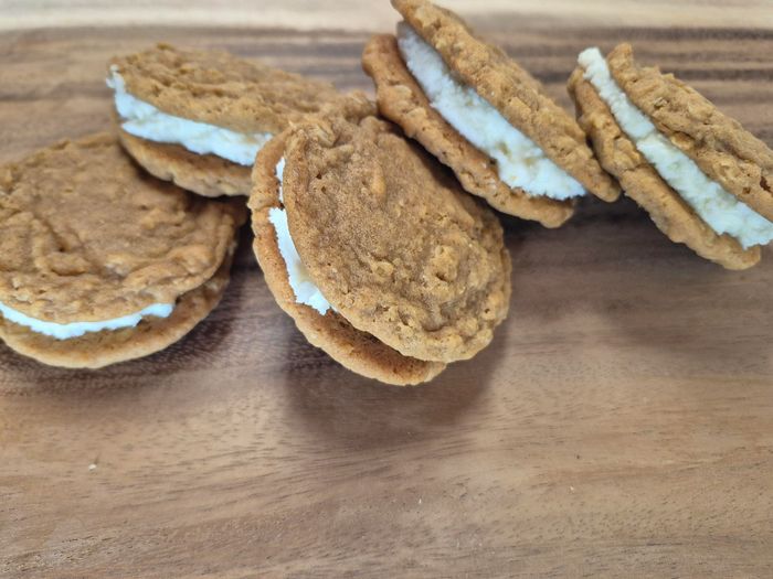 Six oatmeal sandwich cookies with vanilla cream filling.